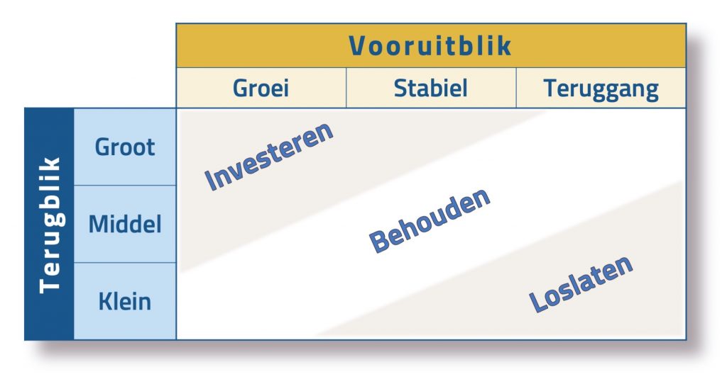 Daarmee ontstaat bijgaande matrix waarin het onderlinge belang van deze markten/klanten zichtbaar wordt. De prioriteiten worden ook zichtbaar. Dat leidt ook naar één van de meest cruciale en praktische vragen voor ondernemerschap: waar te investeren en waar los te laten.